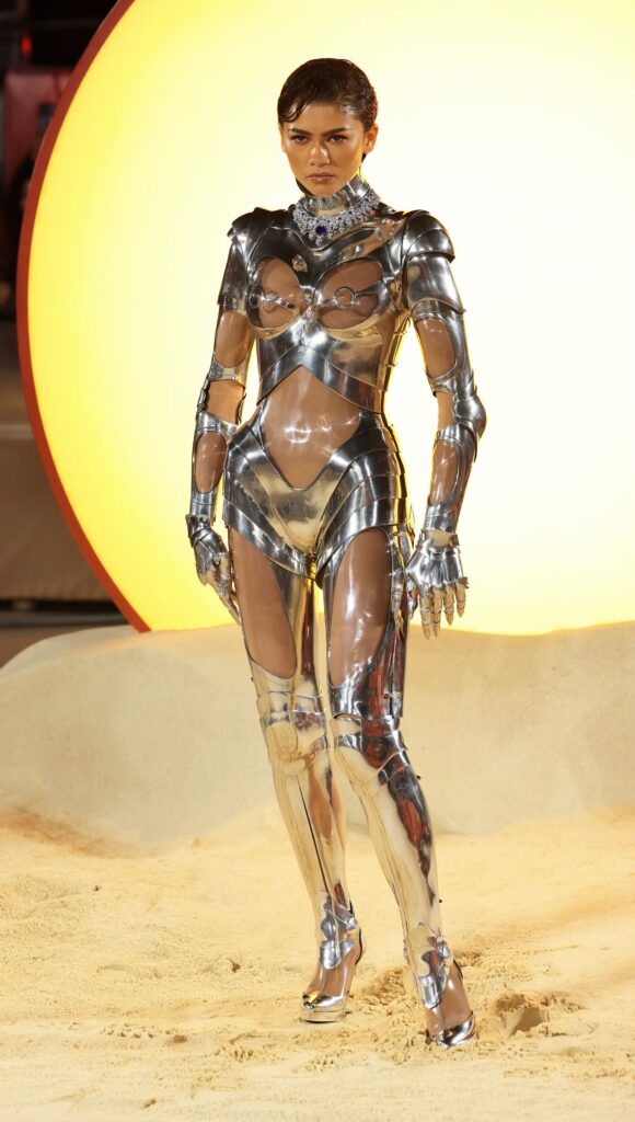 Na estreia de “Dune 2” em Londres, Zendaya usou o icônico traje de robô de metal da lendária coleção de alta costura outono 1995 de Thierry Mugler. (Fonte: Revista W)